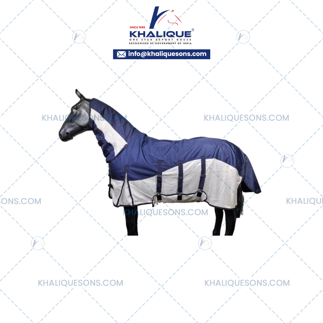 - Polyester lining with meh insert, belly style, 3 x surcingle. Front leg gusset, double breast straps with snap hook, Cross surcingle, Removable leg straps, Tail Flap, , Bar-Tacked on all pressure points. velcro straps for neck closure.